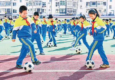 新学期伊始,河北省秦皇岛市海港区耀华小学以足球素质操等活动结合十余种自主游戏项目,让学生在趣味活动中提升体能。图为2月18日,学生在展示足球素质操。 曹建雄摄(人民视觉)