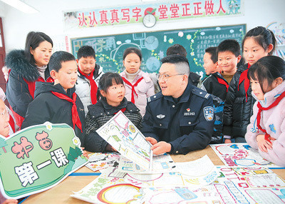 2月18日,在江苏省如皋市下原镇花园小学,派出所民警通过知识普及、主题手抄报等形式,引导小学生科学、文明、安全上网。 徐 慧摄(人民视觉)